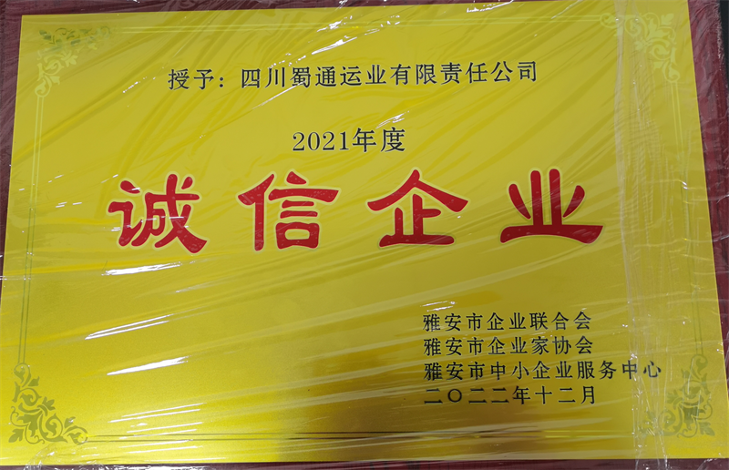 近日,蜀通公司被雅安市企業(yè)聯(lián)合會、雅安市企業(yè)家協(xié)會、雅安市中小企業(yè)服務中心授予“雅安市2021年度誠信企業(yè)”榮譽稱號。