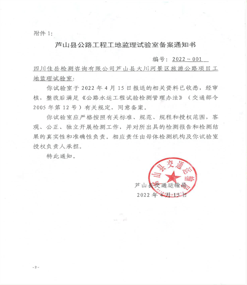 近日,交建集團(tuán)四川佳岳檢測咨詢有限公司蘆山縣大川河景區(qū)旅游公路項目監(jiān)理試驗室,通過蘆山縣交通運輸局備案驗收,標(biāo)志著佳岳公司蘆山監(jiān)理試驗室對蘆山縣大川河景區(qū)旅游公路項目可以獨立開展母體授權(quán)參數(shù)內(nèi)的檢測工作,出具相應(yīng)的檢測報告。
