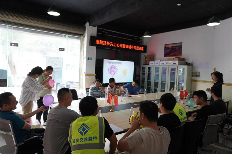 “6.1”蘆山地震發(fā)生后,路橋公司寶興項目部員工親身經歷了全過程,第一時間組織人力、物力參加人員道路搶通保通和生產自救,突發(fā)地震災害對職工造成不同程度的心理沖擊;顒又,左老師與員工們歡聚一堂,以小游戲與員工互動調整大家心理狀態(tài),圍繞員工心理健康常識、常見心理困擾及應對策略和如何緩解工作壓力、控制個人情緒、提高心理健康水平等內容,評估員工心理健康狀況,剖析員工情緒現狀及負面情緒產生的原因,幫助梳理解決方案。