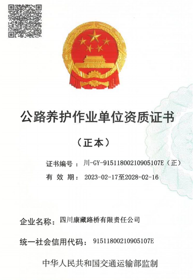 四川康藏路橋有限責任公司取得路基路面養(yǎng)護乙級資質