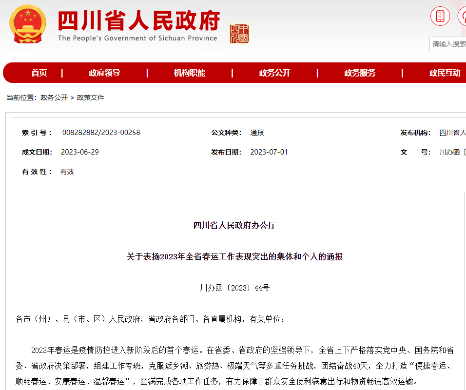 近日,四川省人民政府辦公廳印發(fā)《關(guān)于表揚(yáng)2023年全省春運(yùn)工作表現(xiàn)突出的集體和個(gè)人的通報(bào)》,四川蜀通運(yùn)業(yè)有限公司榮獲 “2023年全省春運(yùn)工作表現(xiàn)突出集體”稱號。