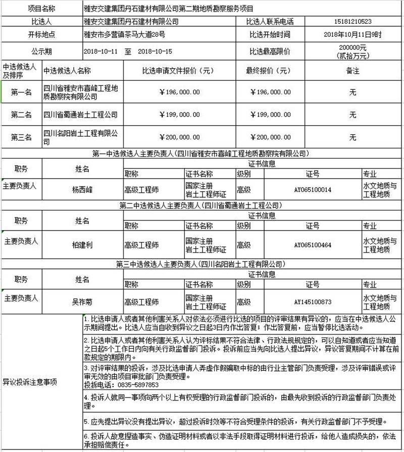 雅安交建集團(tuán)丹石建材有限公司第二期地質(zhì)勘察服務(wù)項目比選公示