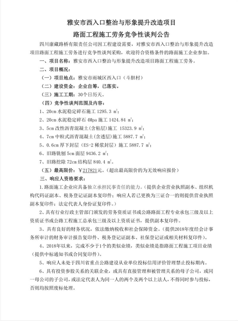 雅安市西入口整治與形象提升改造項(xiàng)目路面工程施工勞務(wù) 競(jìng)爭(zhēng)性談判公告