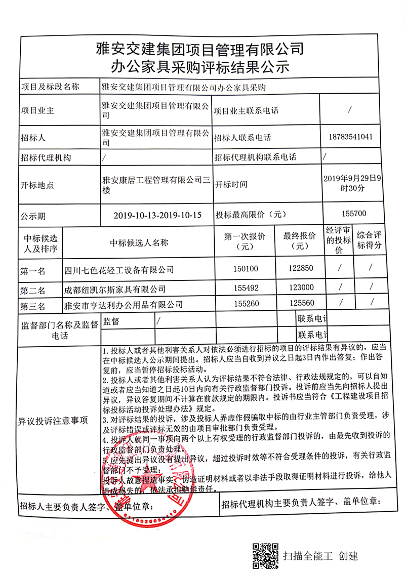 雅安交建集團項目管理有限公司辦公家具采購評標結(jié)果公示