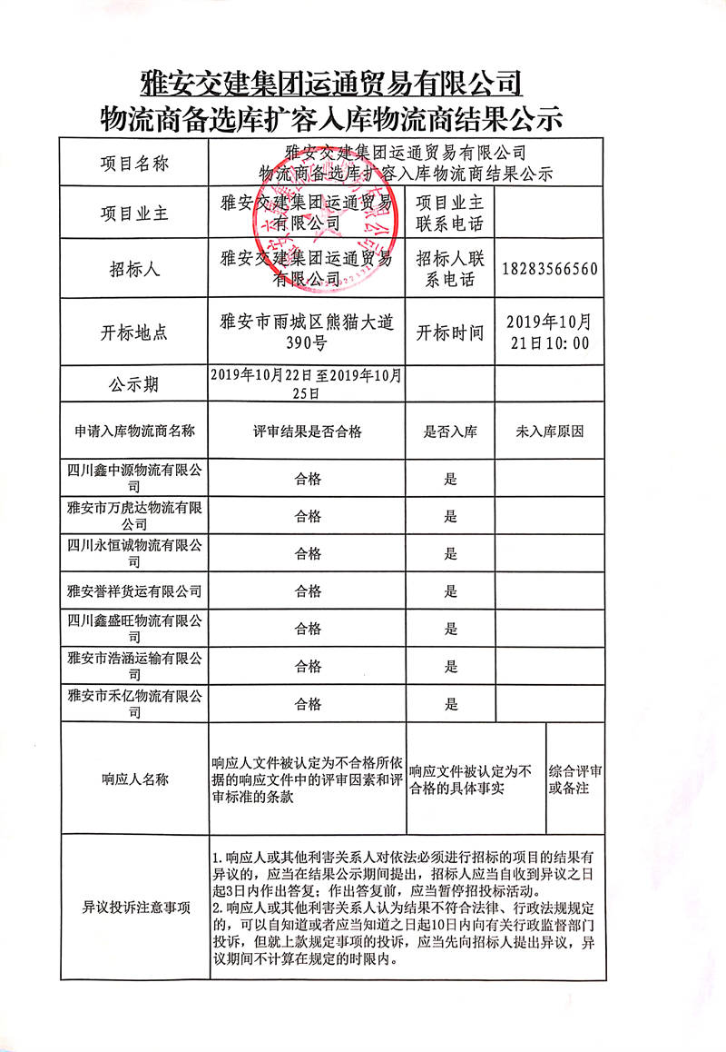 雅安交建集團運通貿(mào)易有限公司物流商備選庫擴容入庫物流商結果公示