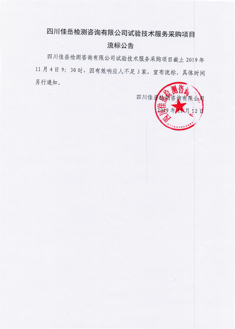 四川佳岳檢測咨詢有限公司試驗(yàn)技術(shù)服務(wù)采購項(xiàng)目流標(biāo)公告