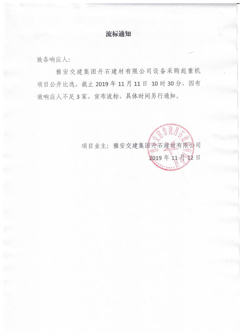 雅安交建集團丹石建材有限公司設(shè)備采購起重機項目流標(biāo)通知