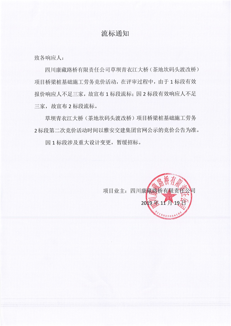 四川康藏路橋有限責(zé)任公司草壩青衣江大橋(茶地坎碼頭渡改橋)項目橋梁樁基礎(chǔ)施工勞務(wù)競價(1標段、2標段)流標通知