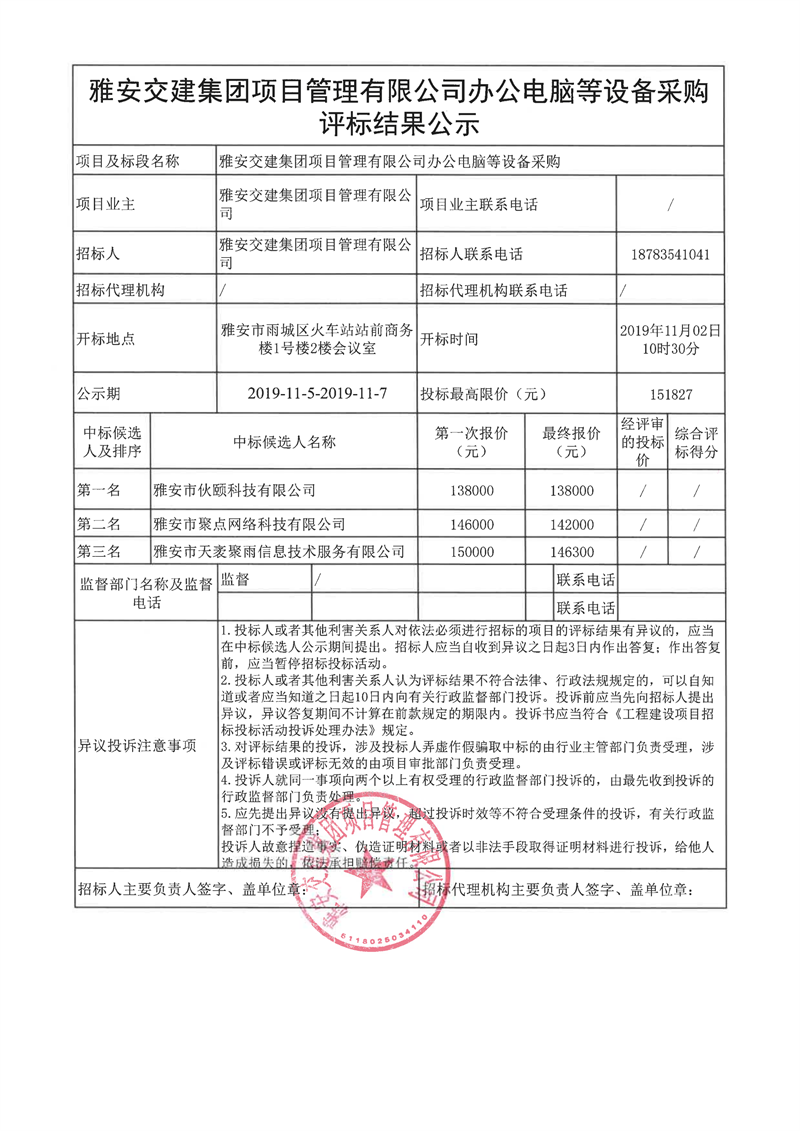 雅安交建集團項目管理有限公司辦公電腦等設(shè)備采購評標結(jié)果公示