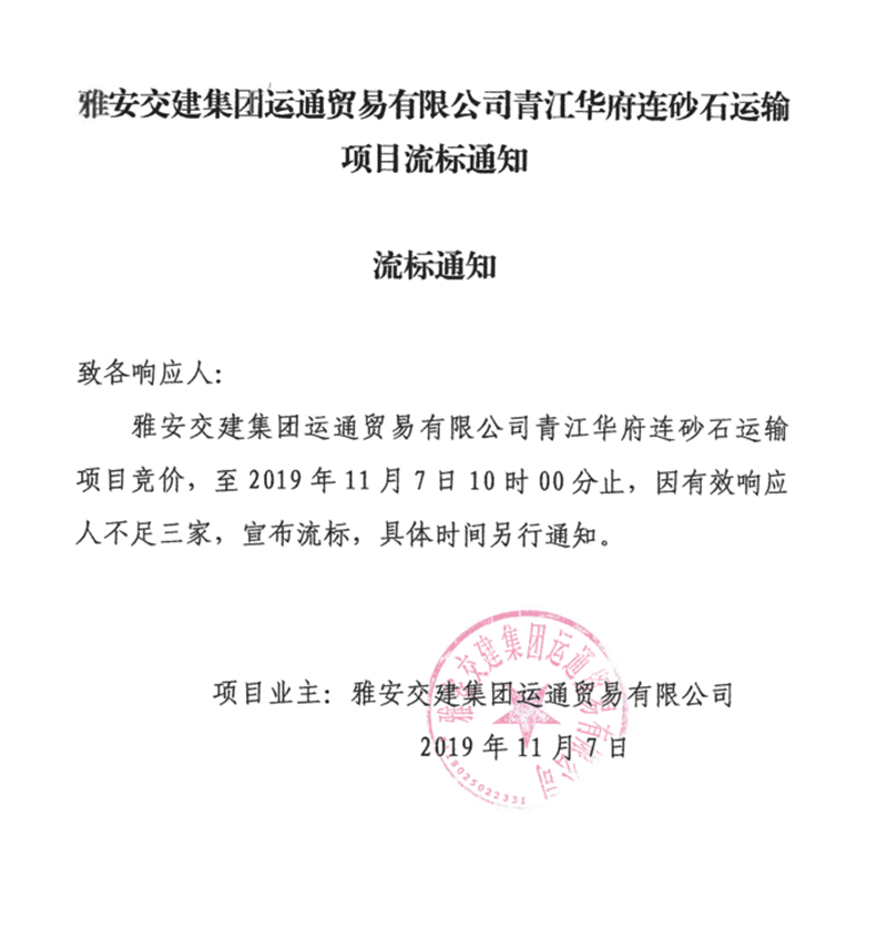 雅安交建集團(tuán)運(yùn)通貿(mào)易有限公司青江華府砂石運(yùn)輸項目流標(biāo)通知