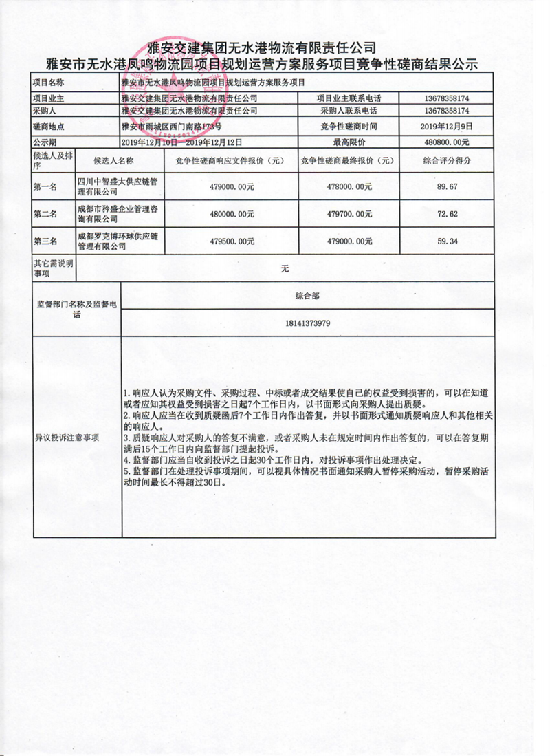 雅安交建集團無水港物流有限責任公司雅安市無水港鳳鳴物流園項目規(guī)劃運營方案服務(wù)項目競爭性磋商結(jié)果公示