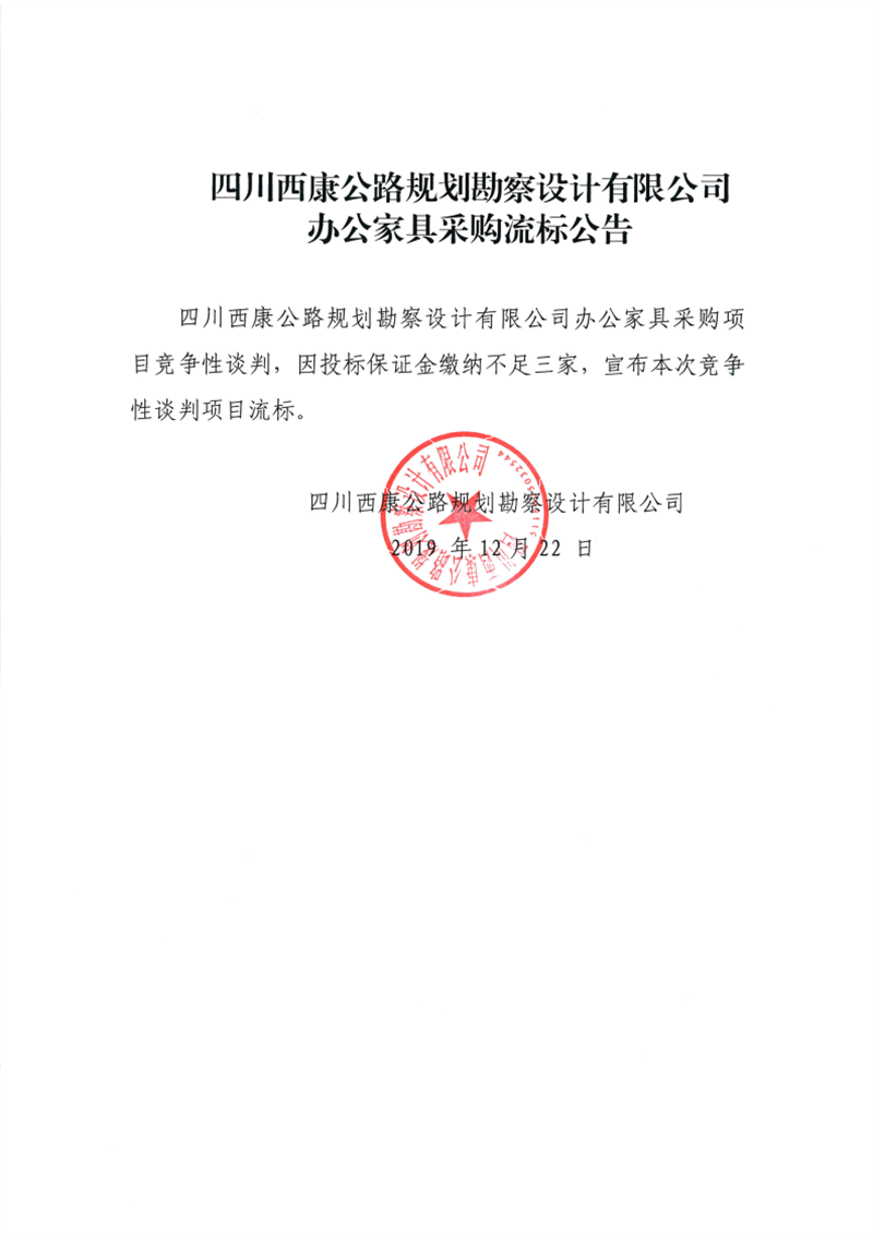 四川西康公路規(guī)劃勘察設(shè)計有限公司辦公家具采購流標公告