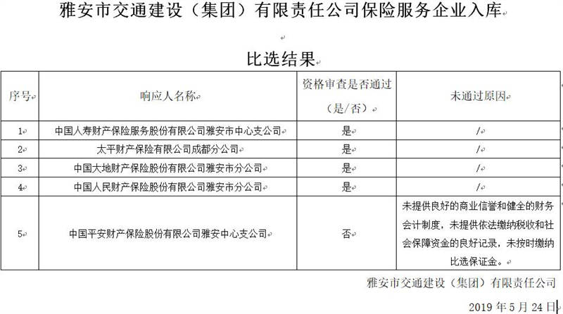雅安市交通建設(shè)(集團)有限責(zé)任公司保險服務(wù)企業(yè)入庫比選結(jié)果公示