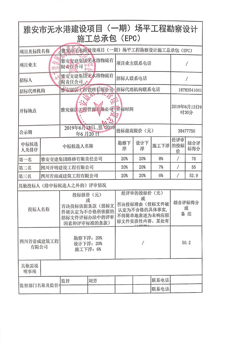 雅安市無水港建設(shè)項(xiàng)目(一期)場平工程勘察設(shè)計施工總承包(EPC)公開招標(biāo)結(jié)果公示