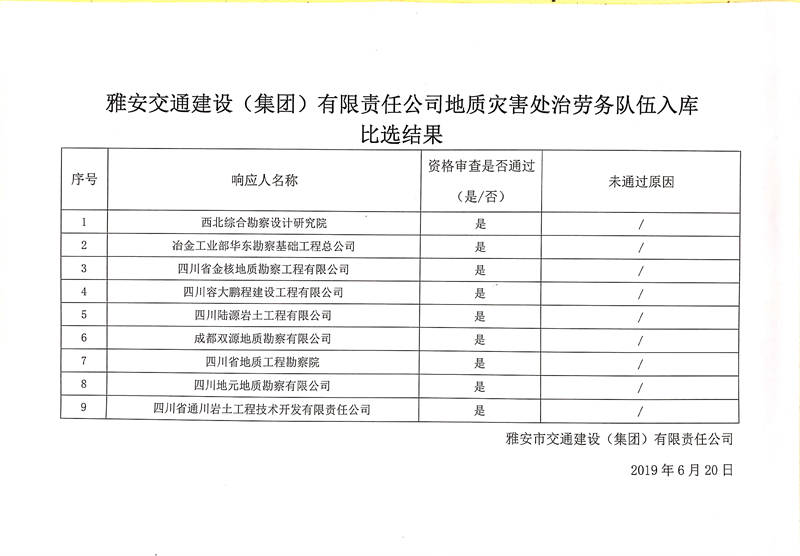 雅安交通建設(shè)(集團(tuán))有限責(zé)任公司地質(zhì)災(zāi)害處治勞務(wù)隊(duì)伍入庫(kù)比選結(jié)果