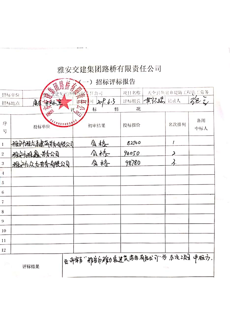 雅安交建集團(tuán)路橋有限責(zé)任公司天全縣魚(yú)泉鄉(xiāng)堤防工程施工勞務(wù)項(xiàng)目邀請(qǐng)招標(biāo)結(jié)果公示