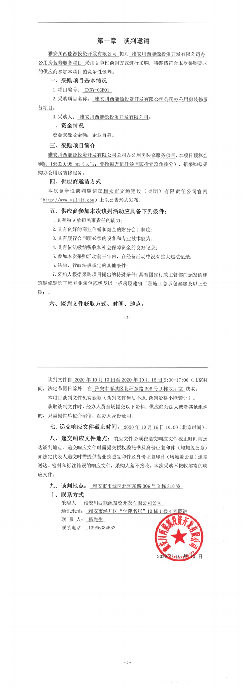 雅安川西能源投資開發(fā)有限公司辦公用房裝修服務(wù)項(xiàng)目競爭性談判公告