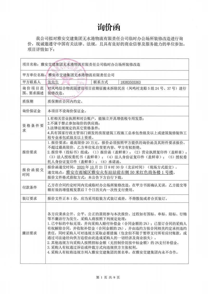 雅安交建集團(tuán)無水港物流有限責(zé)任公司臨時(shí)辦公場所裝修改造詢價(jià)函