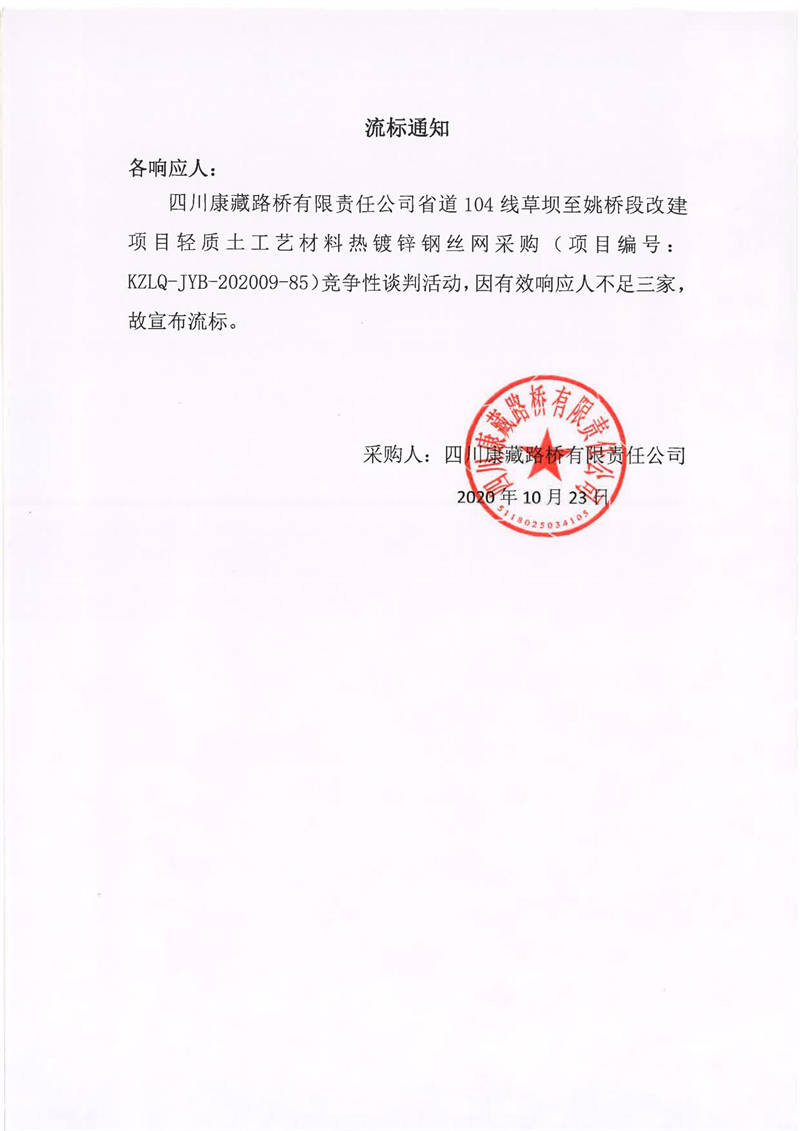 四川康藏路橋有限責(zé)任公司省道104線草壩至姚橋段改建項(xiàng)目輕質(zhì)土工藝材料熱鍍鋅鋼絲網(wǎng)采購(gòu)項(xiàng)目流標(biāo)通知