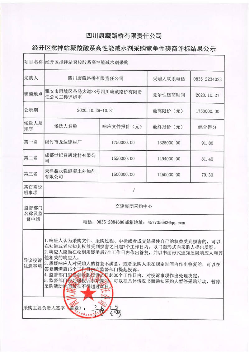 四川康藏路橋有限責(zé)任公司經(jīng)開區(qū)攪攔站聚羧酸系高性能減水劑采購競爭性磋商評標(biāo)結(jié)果公示