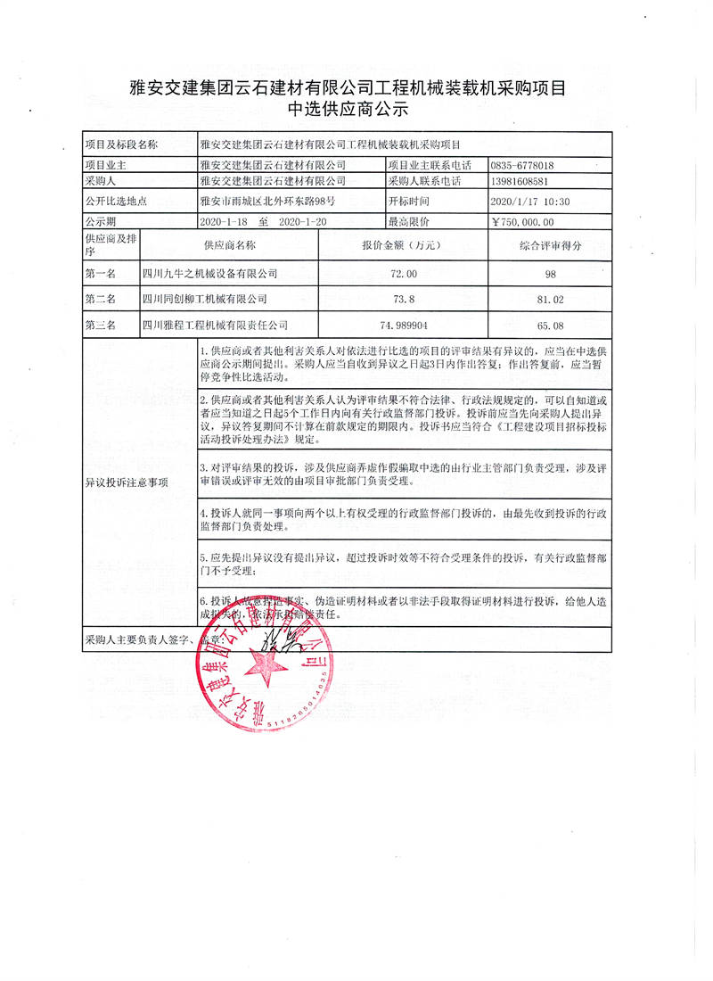 雅安交建集團(tuán)云石建材有限公司工程機(jī)械裝載機(jī)采購項(xiàng)目中選供應(yīng)商公示