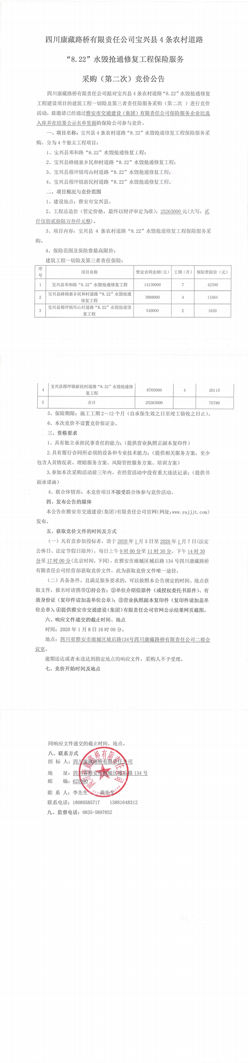 四川康藏路橋有限責(zé)任公司寶興縣4條農(nóng)村道路“8.22”水毀搶通修復(fù)工程保險(xiǎn)服務(wù)采購(第二次)競(jìng)價(jià)公告