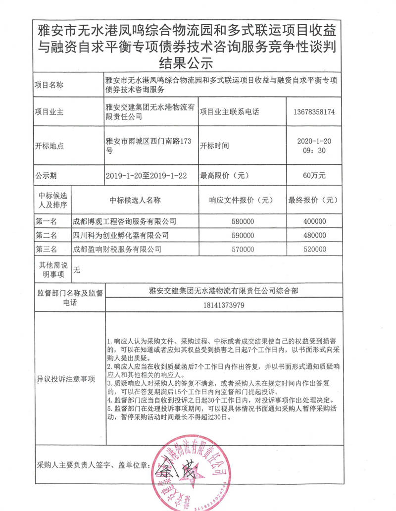 雅安市無水港鳳鳴綜合物流園和多式聯(lián)運項目收益與融資自求平衡專項債券技術(shù)咨詢服務(wù)競爭性談判結(jié)果公示