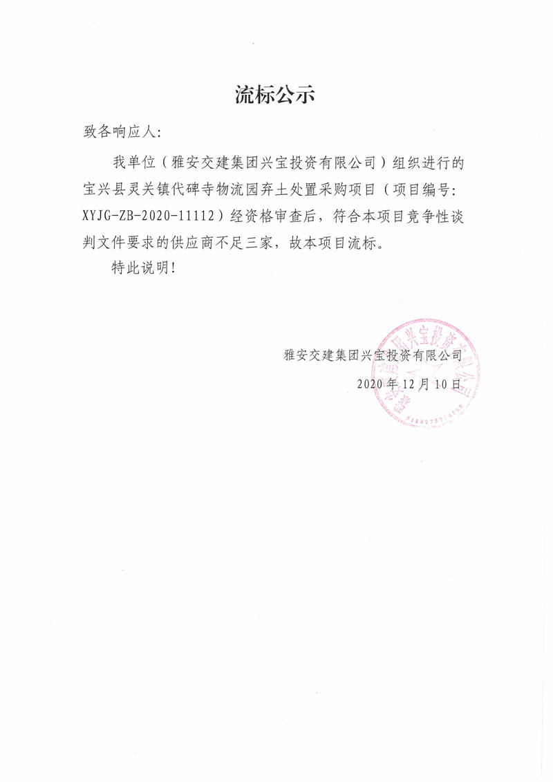 雅安交建集團興寶投資有限公司寶興縣靈關(guān)鎮(zhèn)代碑寺物流園棄土處置采購項目流標(biāo)公示