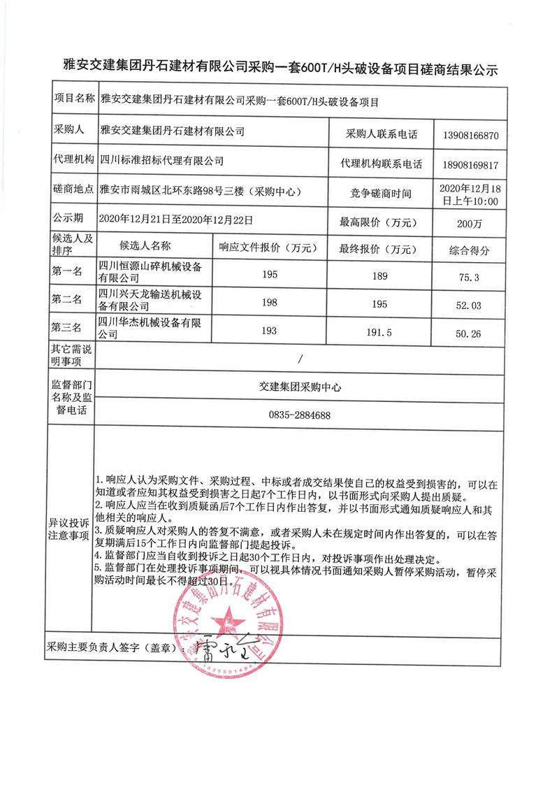 雅安交建集團(tuán)丹石建材有限公司采購一套600T/H頭破設(shè)備項(xiàng)目磋商結(jié)果公示