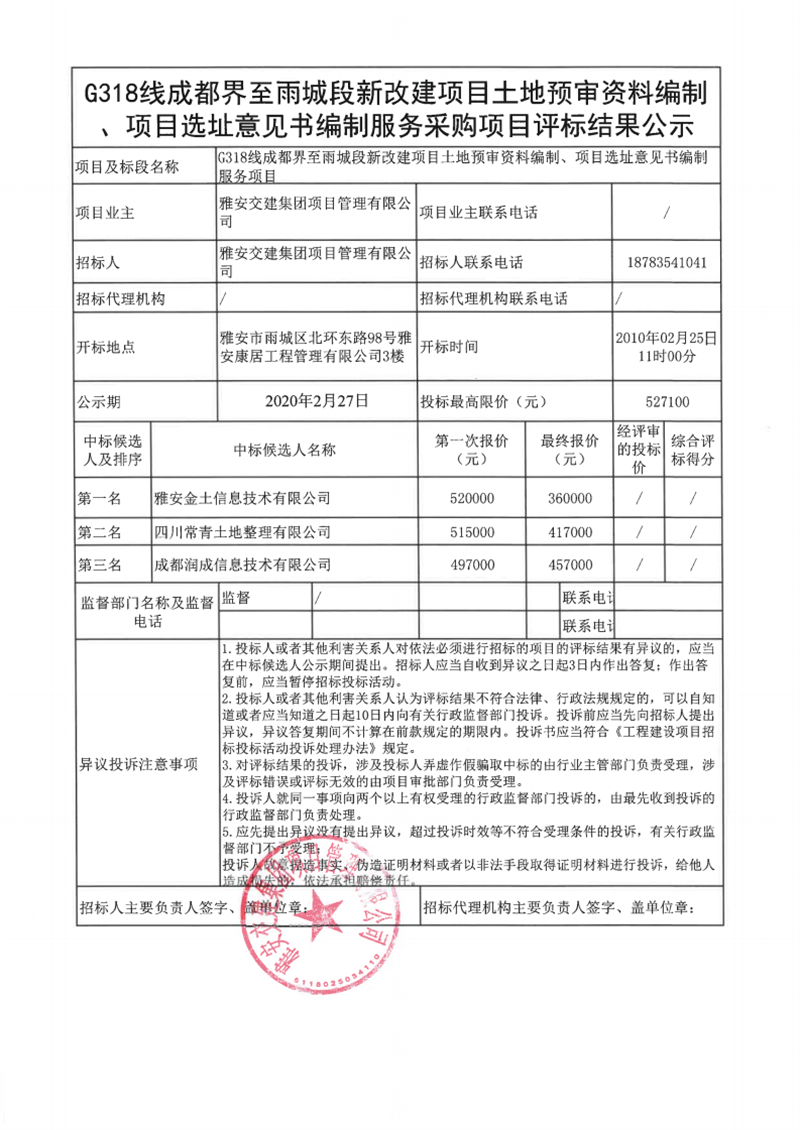 雅安交建集團(tuán)項目管理有限公司G318線成都界至雨城段新改建項目土地預(yù)審資料編制、項目選址意見書編制服務(wù)采購項目評標(biāo)結(jié)果公示