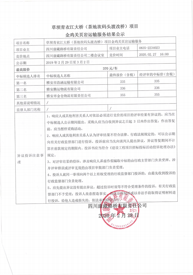 四川康藏路橋有限責(zé)任公司草壩青衣江大橋(茶地坎碼頭渡改橋)項目金雞關(guān)頁巖運輸服務(wù)結(jié)果公示