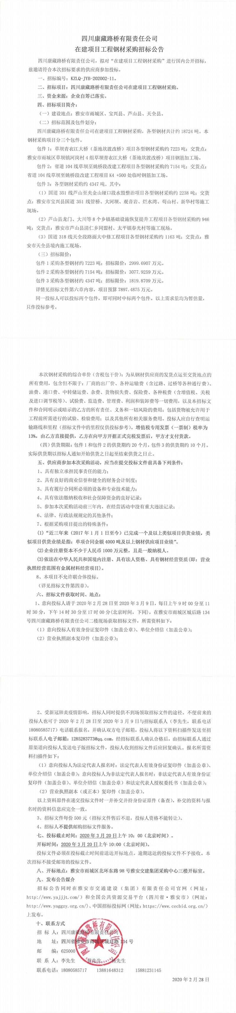 四川康藏路橋有限責任公司在建項目工程鋼材采購招標公告