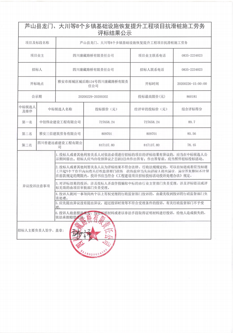 四川康藏路橋有限責(zé)任公司蘆山縣龍門、大川等8個鄉(xiāng)鎮(zhèn)基礎(chǔ)設(shè)施恢復(fù)提升工程項目抗滑樁施工勞務(wù)評標結(jié)果公示