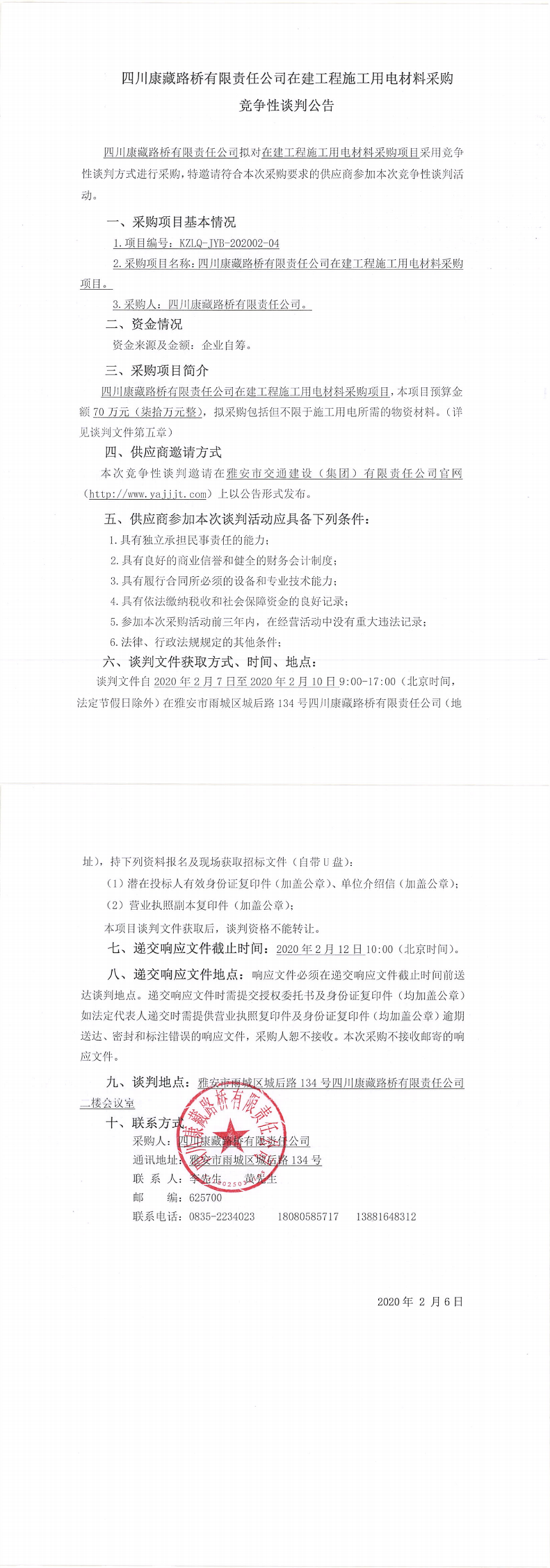 四川康藏路橋有限責(zé)任公司在建工程施工用電材料采購競(jìng)爭(zhēng)性談判公告