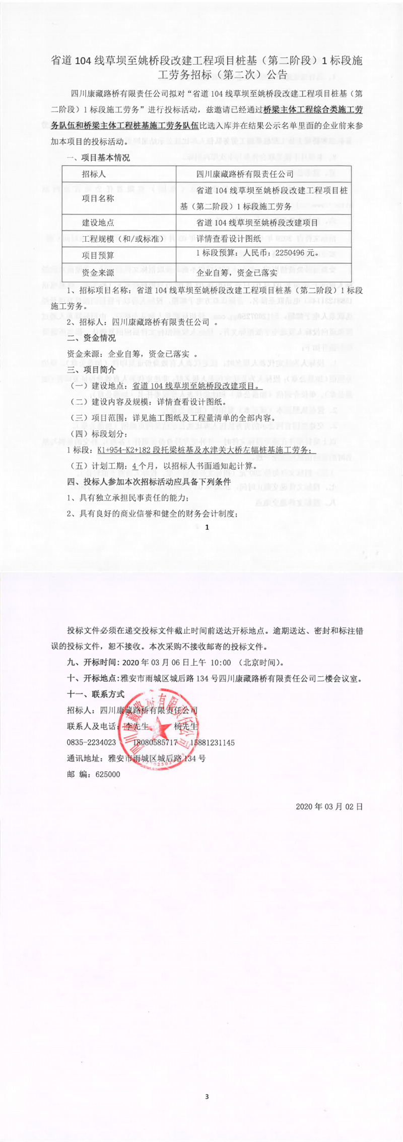 四川康藏路橋有限責任公司省道104線草壩至姚橋段改建工程項目樁基(第二階段)1標段施工勞務(wù)招標(第二次)公告