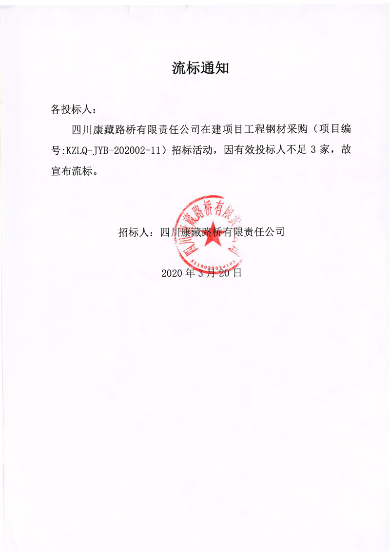 四川康藏路橋有限責(zé)任公司在建項目工程鋼材采購流標通知