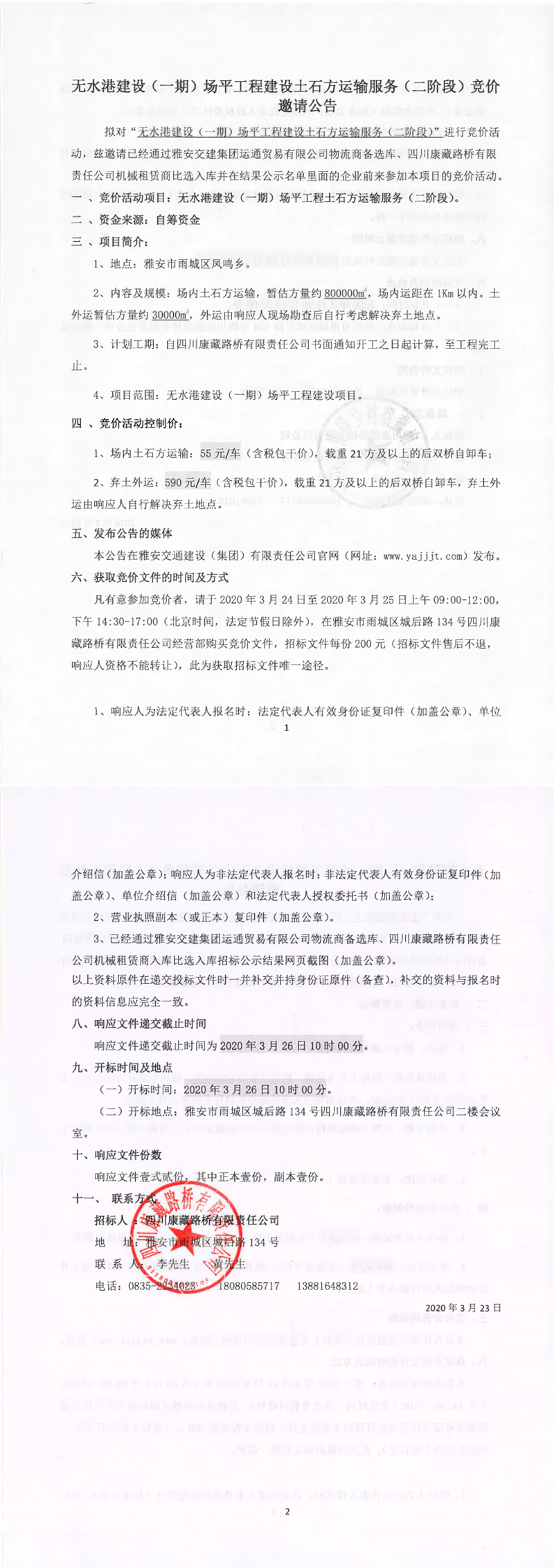 四川康藏路橋有限責任公司無水港建設(一期)場平工程建設土石方運輸服務(二階段)競價邀請公告