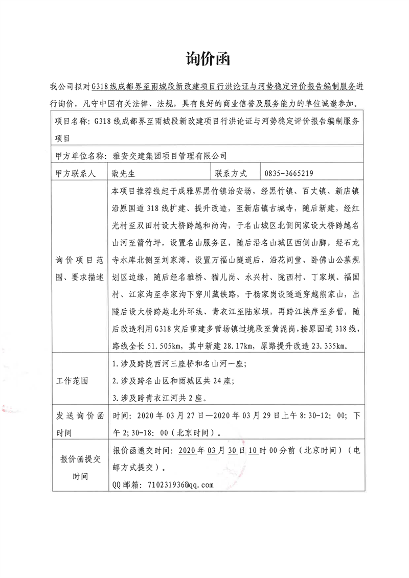 雅安交建集團(tuán)項(xiàng)目管理有限公司G318線成都界至雨城段新改建項(xiàng)目行洪論證與河勢(shì)穩(wěn)定評(píng)價(jià)報(bào)告編制服務(wù)項(xiàng)目詢價(jià)函