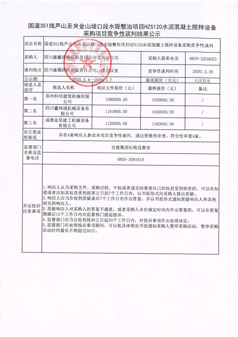 四川康藏路橋有限責任公司國道351線蘆山至夾金山埡口段水毀整治項目在建工程項目HZS120水泥混凝土攪拌設備采購項目競爭性談判結(jié)果公示