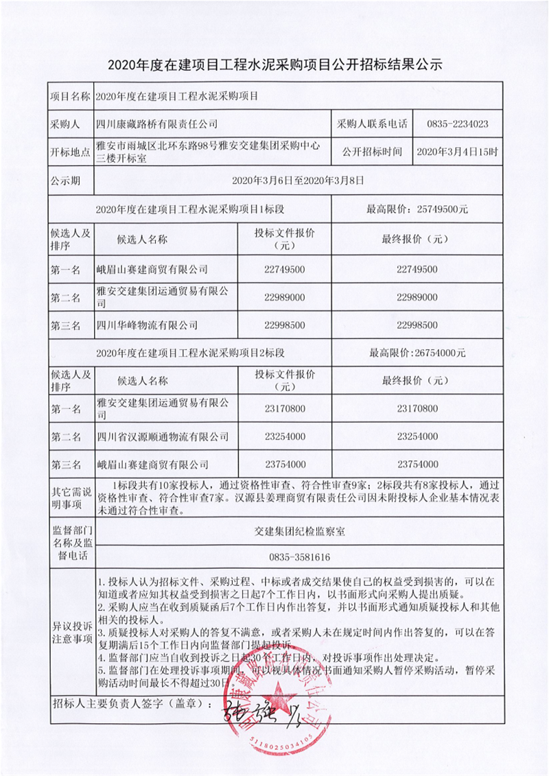 四川康藏路橋有限責(zé)任公司2020年度在建項目工程水泥采購項目公開招標(biāo)結(jié)果公示