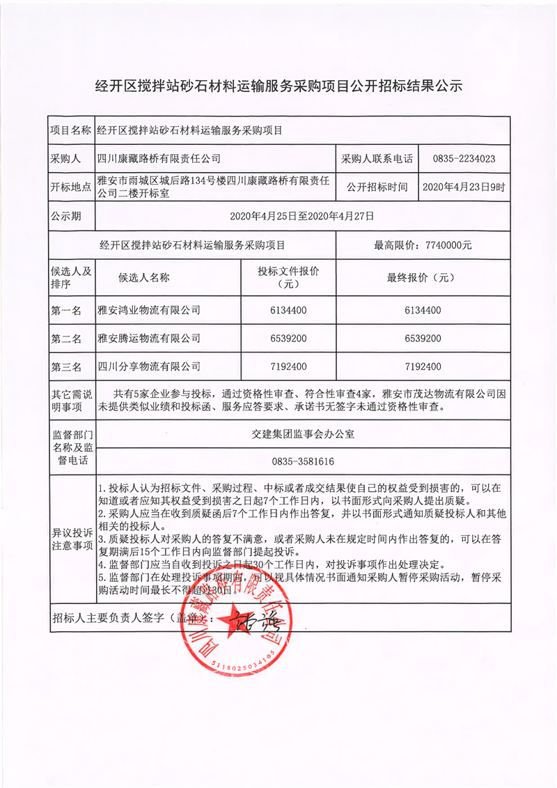 四川康藏路橋有限責任公司經(jīng)開區(qū)攪拌站砂石材料運輸服務(wù)采購項目公開招標結(jié)果公示