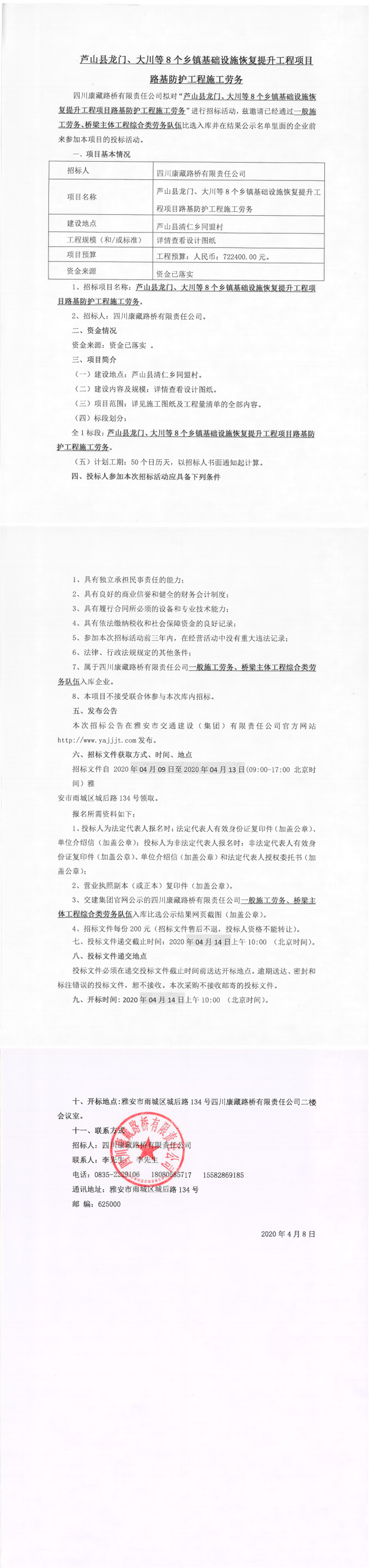 四川康藏路橋有限責(zé)任公司蘆山縣龍門、大川等8個鄉(xiāng)鎮(zhèn)基礎(chǔ)設(shè)施恢復(fù)提升工程項(xiàng)目路基防護(hù)工程施工勞務(wù)招標(biāo)公告