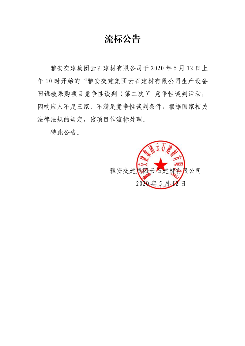 雅安交建集團(tuán)云石建材有限公司生產(chǎn)設(shè)備圓錐破采購(gòu)項(xiàng)目(第二次)流標(biāo)公告
