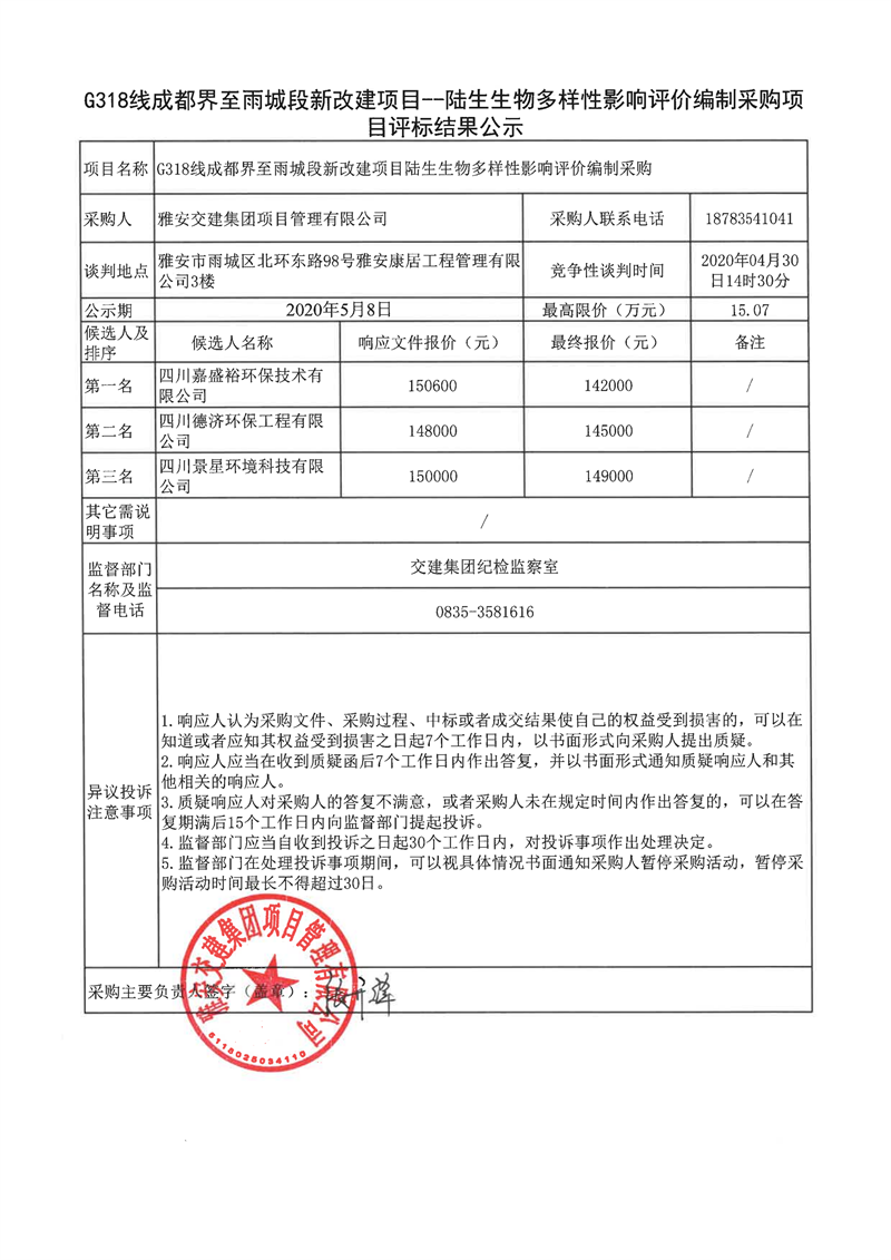 雅安交建集團(tuán)項(xiàng)目管理有限公司G318線成都界至雨城段新改建項(xiàng)目陸生生物多樣性影響評(píng)價(jià)編制采購項(xiàng)目評(píng)標(biāo)結(jié)果公示