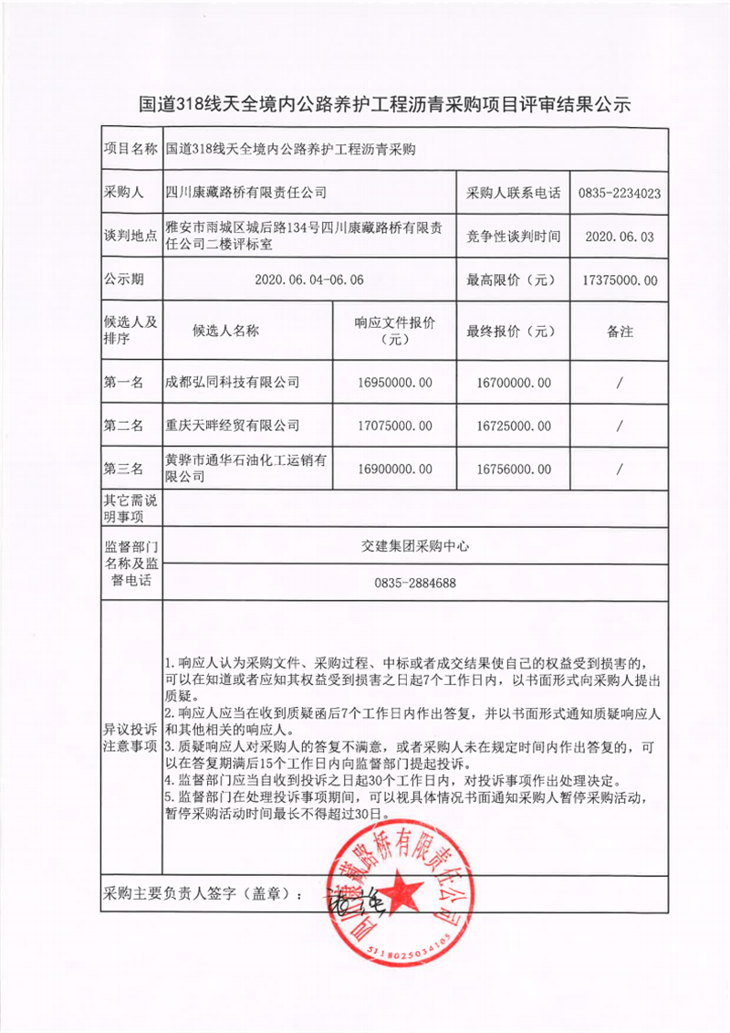 四川康藏路橋有限責(zé)任公司國(guó)道318線天全境內(nèi)公路養(yǎng)護(hù)工程瀝青采購(gòu)項(xiàng)目評(píng)審結(jié)果公示