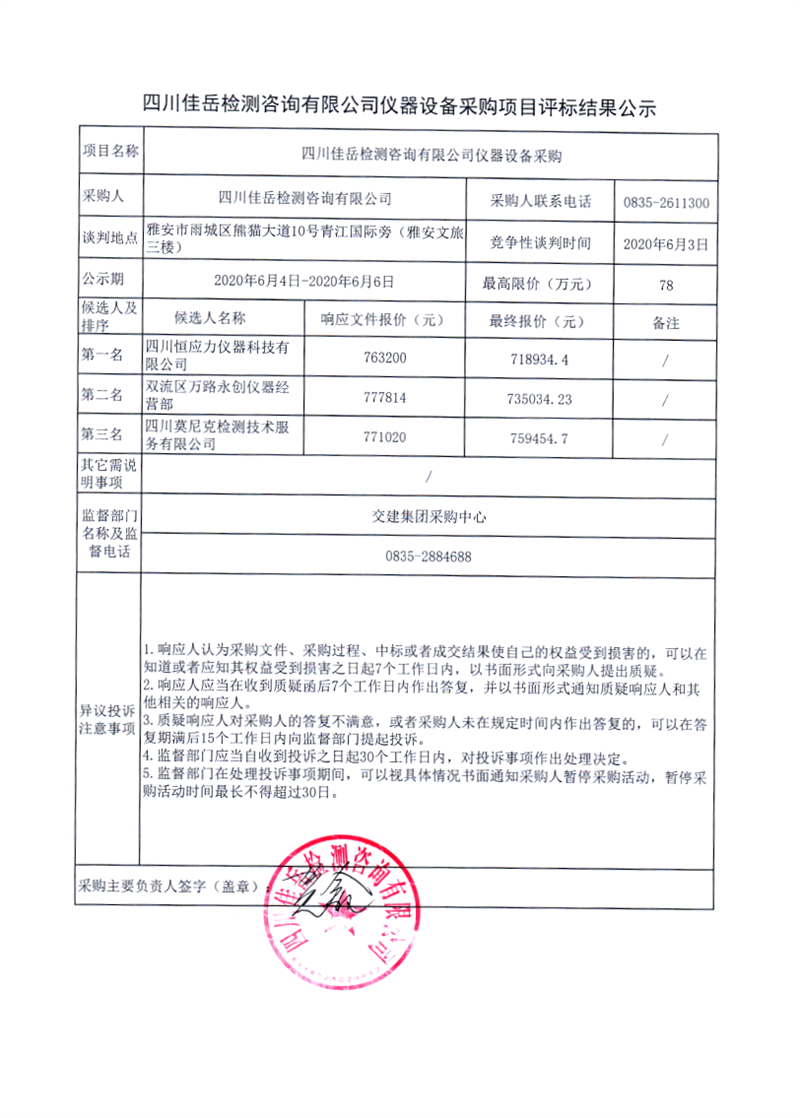 四川佳岳檢測(cè)咨詢有限公司儀器設(shè)備采購(gòu)項(xiàng)目評(píng)標(biāo)結(jié)果公示