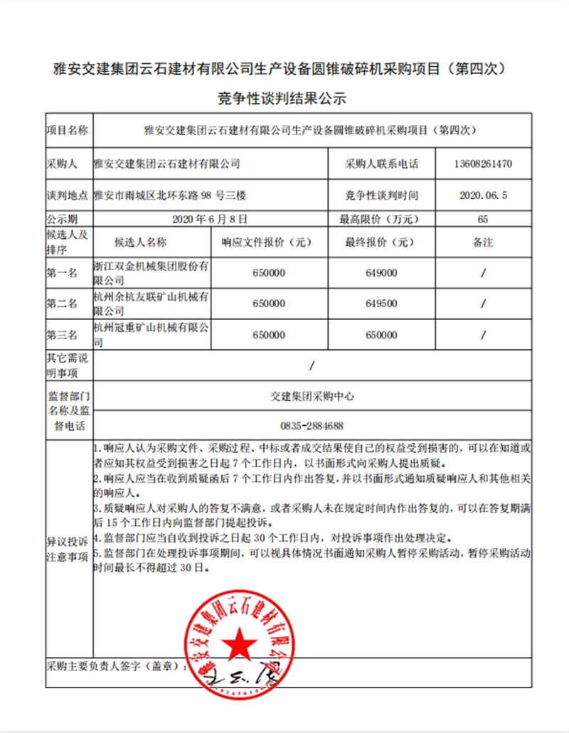 雅安交建集團(tuán)云石建材有限公司生產(chǎn)設(shè)備圓錐破碎機(jī)采購項(xiàng)目(第四次)競爭性談判結(jié)果公示