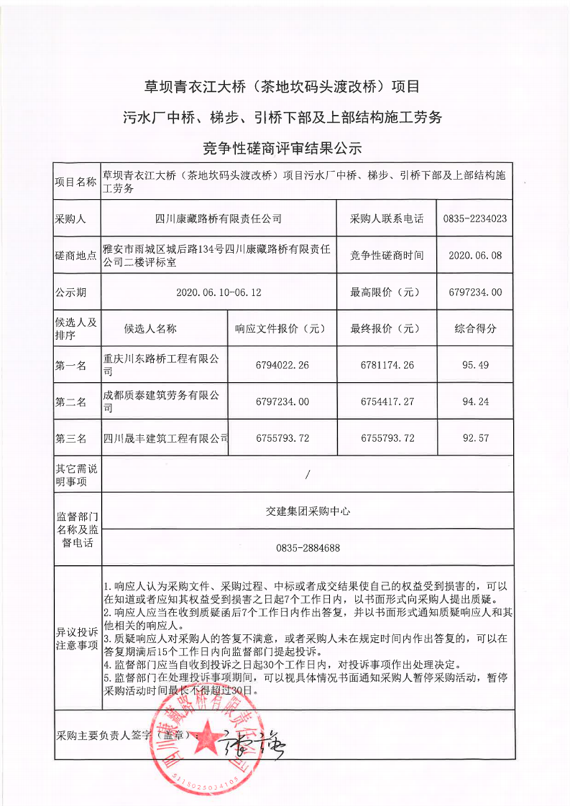 四川康藏路橋有限責(zé)任公司草壩青衣江大橋(茶地坎碼頭渡改橋)項(xiàng)目污水廠中橋、梯步、引橋下部及上部結(jié)構(gòu)施工勞務(wù)競爭性磋商評審結(jié)果公示