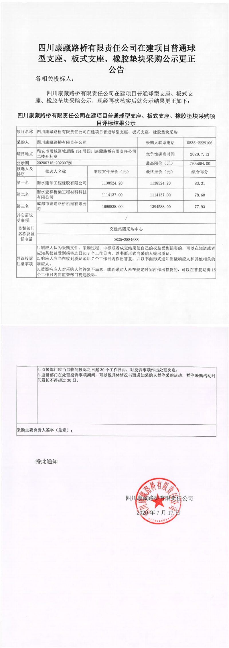 四川康藏路橋有限責任公司在建項目普通球型支座、板式支座、橡膠墊塊采購公示更正公告