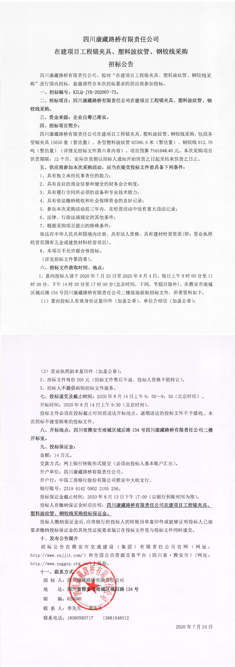 四川康藏路橋有限責(zé)任公司在建項目工程錨夾具、塑料波紋管、鋼鉸線采購招標公告